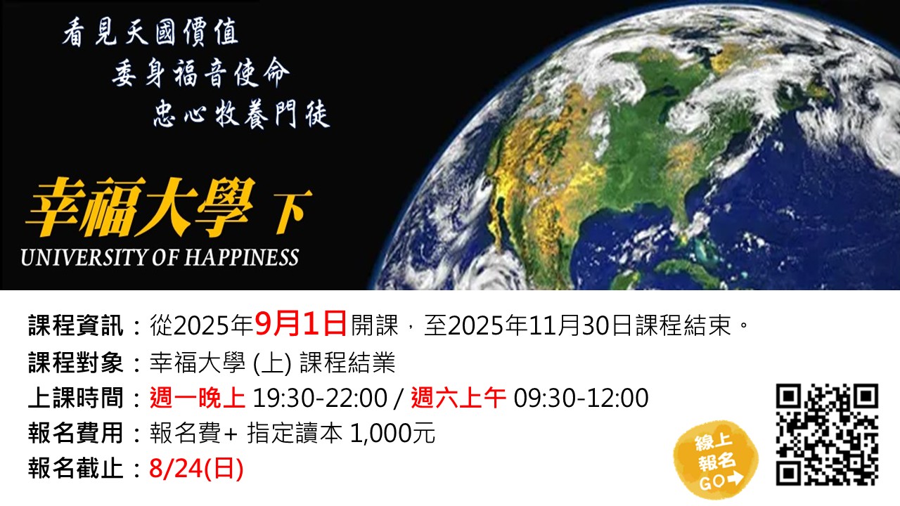 《第三期 幸福大學(下)》將於9月1日開課!讓我們持續在神的真道上扎根,堅定心志,專心跟從主。 本期開二班,十二堂課程,一律採線上報名。 費用:1000元 報名截止:8月24日(日) 報名連結:https://reurl.cc/Lnnj43
